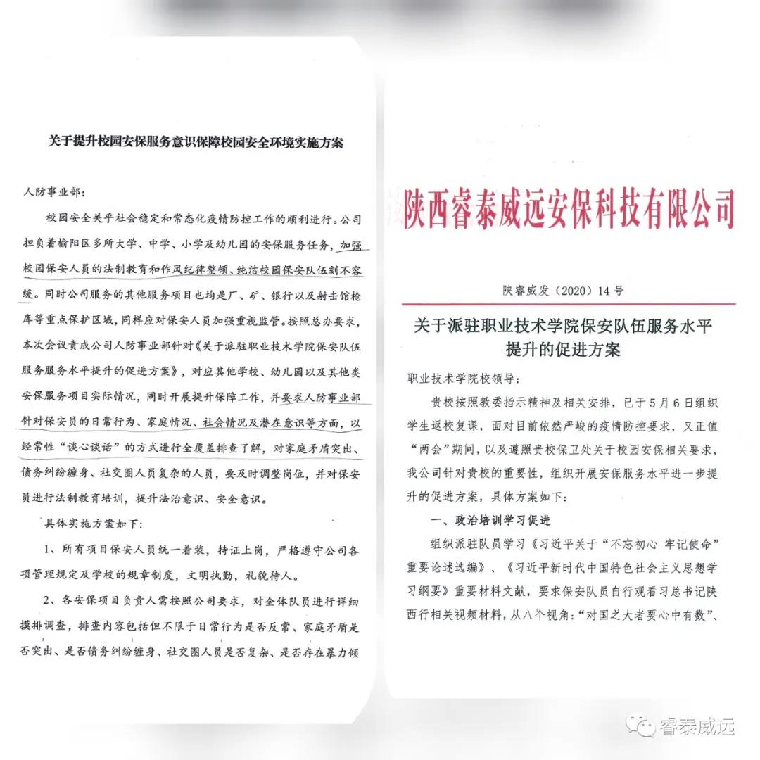 質(zhì)檢中心經(jīng)理齊健要求各分隊(duì)要提高政治站位,深刻吸取各類(lèi)涉校安全事故教訓(xùn),高度重視校園保安員安全管理工作;全面認(rèn)真排查隊(duì)伍情況,圍繞校園保安思想情況、精神狀態(tài)、執(zhí)勤現(xiàn)狀開(kāi)展一次全面摸排,對(duì)家庭矛盾突出、債務(wù)糾紛纏身、社交圈人員復(fù)雜的人員,要及時(shí)調(diào)整崗位或清退,并對(duì)保安員進(jìn)行法制教育培訓(xùn),提升法治意識(shí)、安全意識(shí),啟動(dòng)新一輪保安員背景審查工作;形成人防部領(lǐng)導(dǎo)機(jī)構(gòu)責(zé)任制,分解任務(wù),落實(shí)責(zé)任。以季度形式匯總保安員談心談話(huà)思想動(dòng)態(tài),存檔備查。