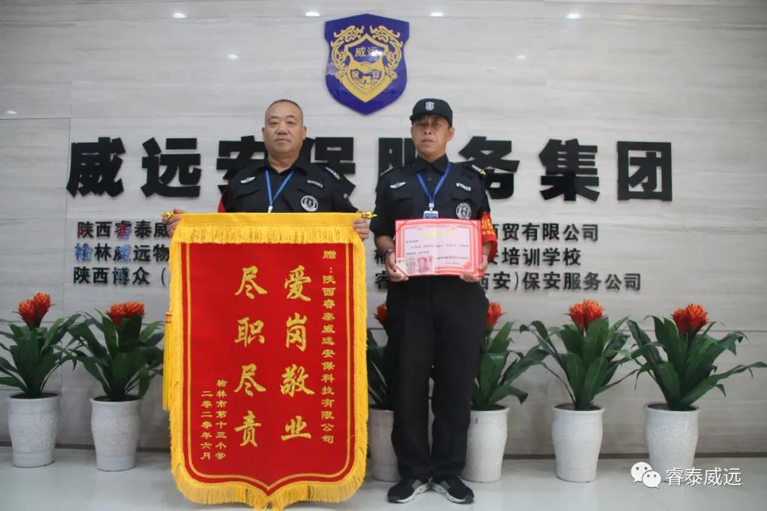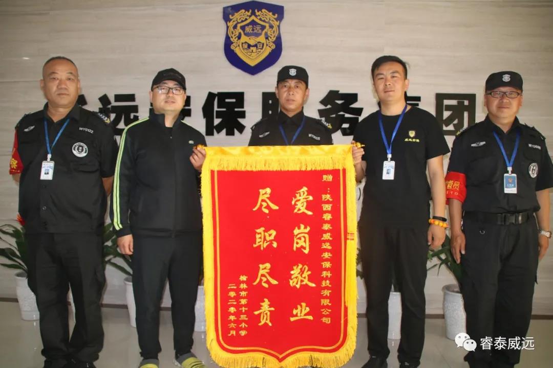 公司新聞2020年6月9日上午,榆林市第十三小學(xué)校方領(lǐng)導(dǎo)親自將一面繡著“愛崗敬業(yè) 盡職盡責(zé)”贊語的錦旗贈送于陜西睿泰威遠(yuǎn)安保科技有限公司,對該駐點派遣的保安員高度的責(zé)任心、盡忠職守的工作態(tài)度給予了贊揚,以薛軍和同志為學(xué)習(xí)榜樣,并對保安員們在疫情期間對保衛(wèi)學(xué)校安全,維護學(xué)校秩序做出的貢獻(xiàn)表示感謝。