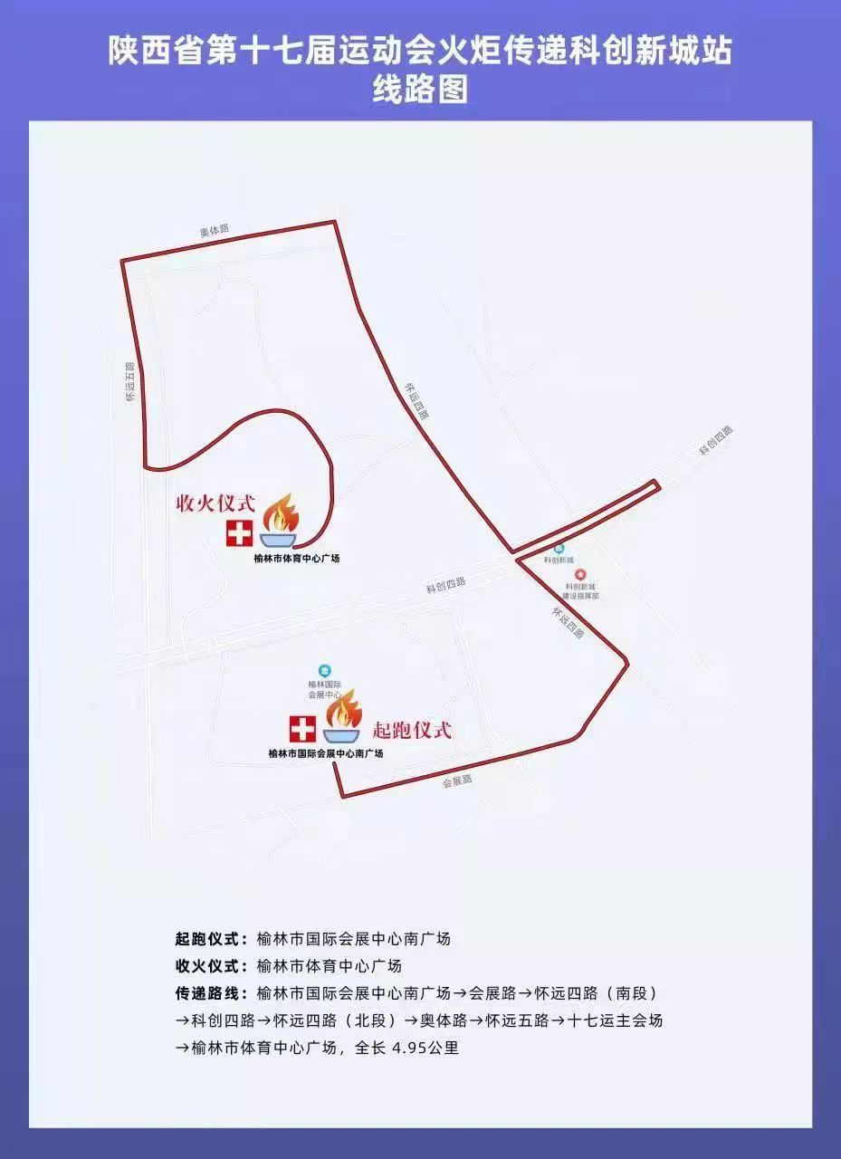 火炬?zhèn)鬟f路線從榆林市國際會展中心南廣場——榆林市體育中心廣場,沿線全長4.95公里。