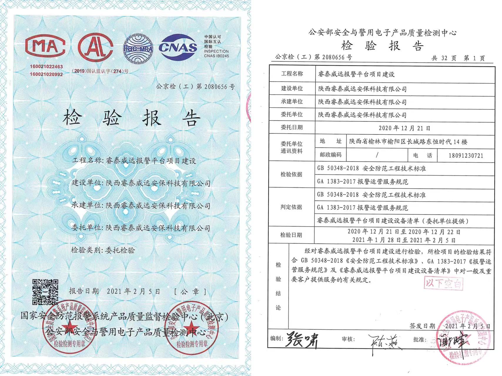 根據(jù)公安部出臺的最新《報警運營服務規(guī)范》規(guī)定,我集團于2021年2月5日通過國家安全防范報警系統(tǒng)產(chǎn)品質量監(jiān)督檢驗中心(北京)、公安部安全與警用電子產(chǎn)品質量檢測中心檢驗,符合《報警運營服務規(guī)范(GA1383-2017)》,具備從事報警運營服務的資格。