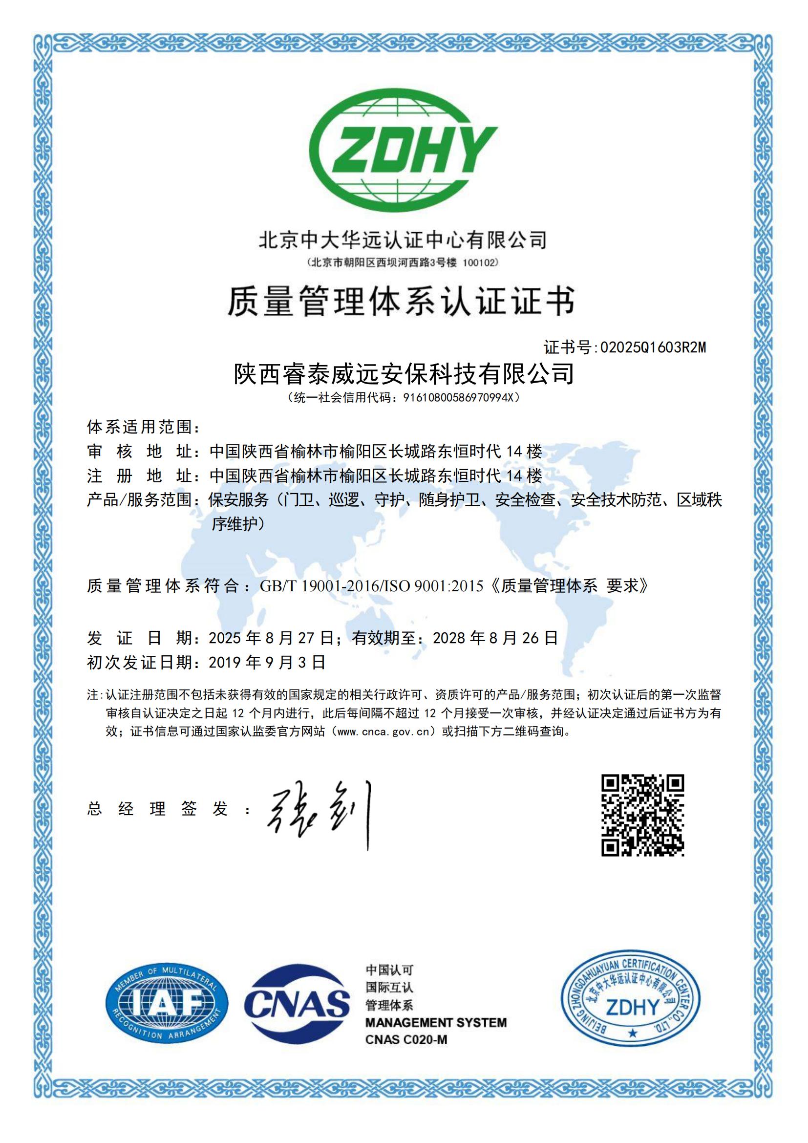 質(zhì)量管理體系認證證書